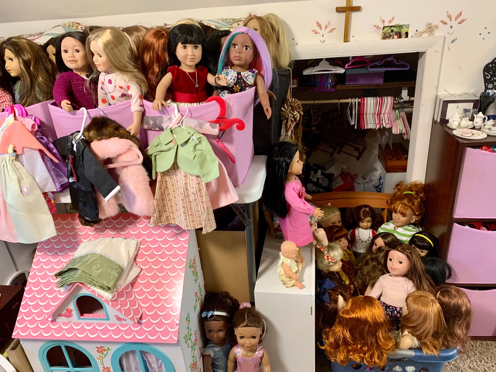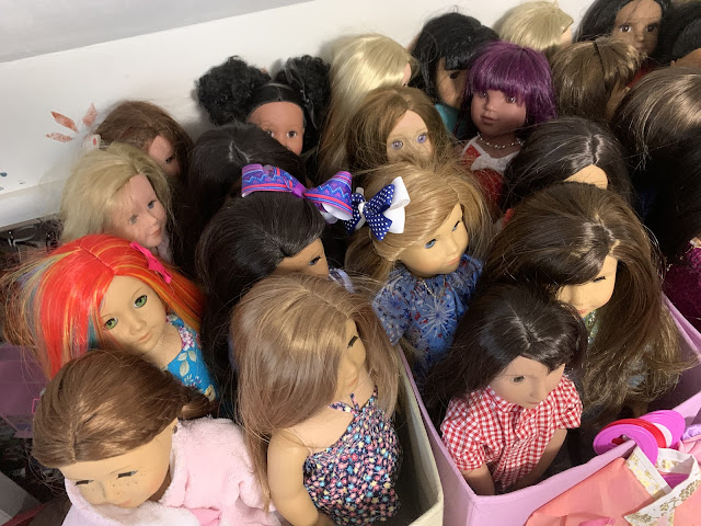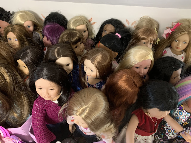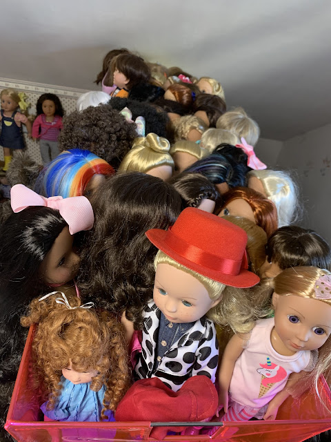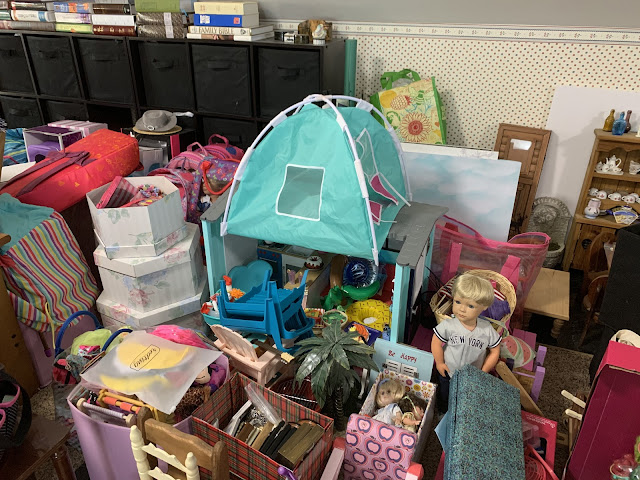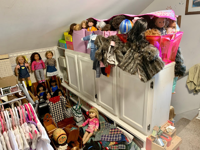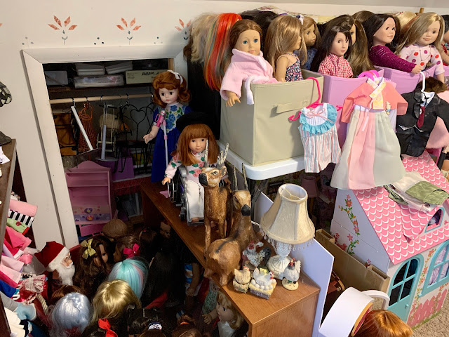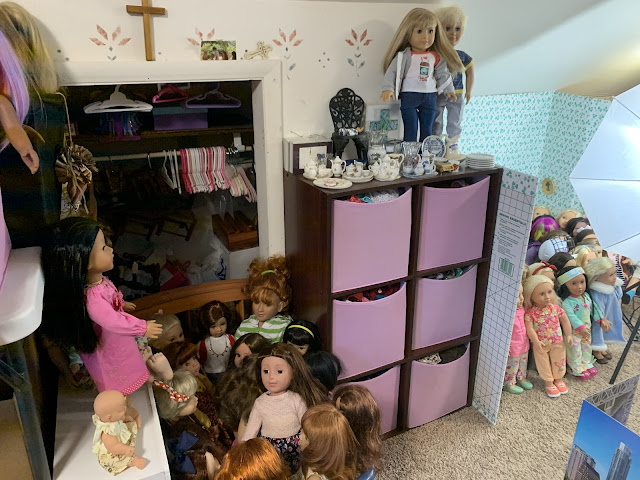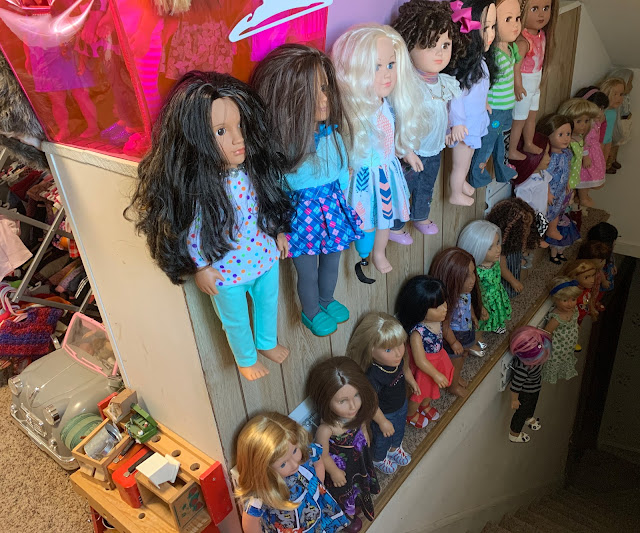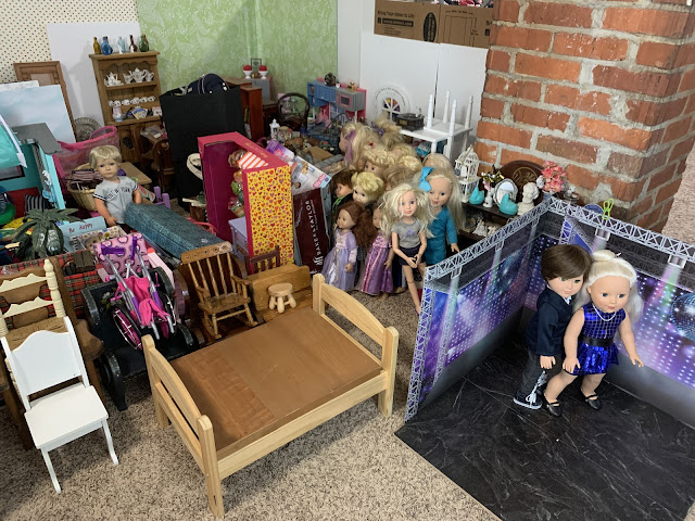 Behind them is the doll kitchen (see in the corner there) surrounded by all manner of doll furniture and accessories... All of hte dolls in that grouping right behind Josh and Heather Doll? They are all, every single one, dolls that have been thrifted lately (in the last few months) and who are sitting there waiting for their makeovers. I don't know if you can see her but I even have a nearly new JoJo Siwa doll in there.