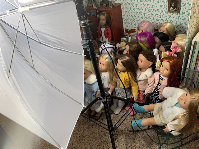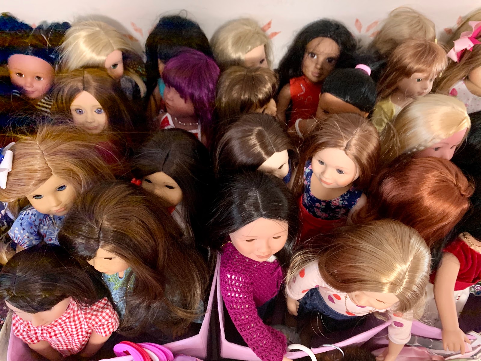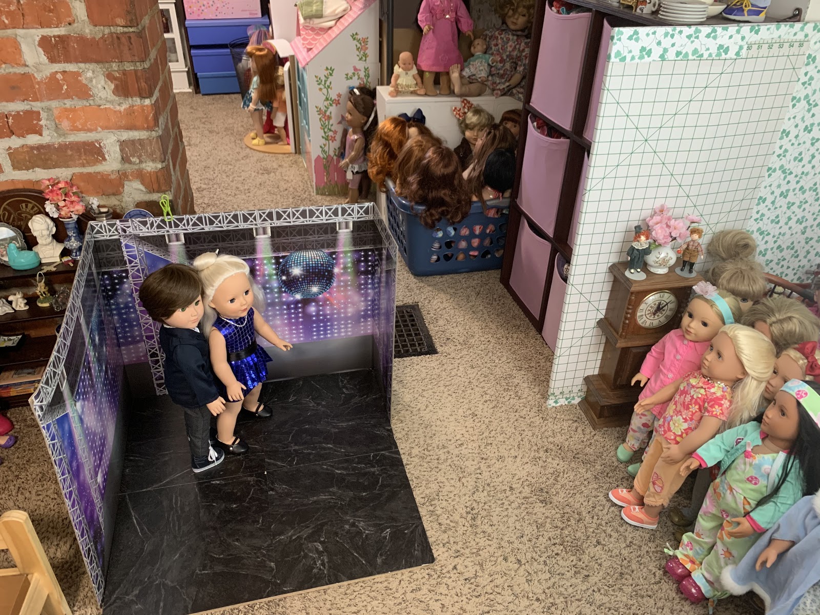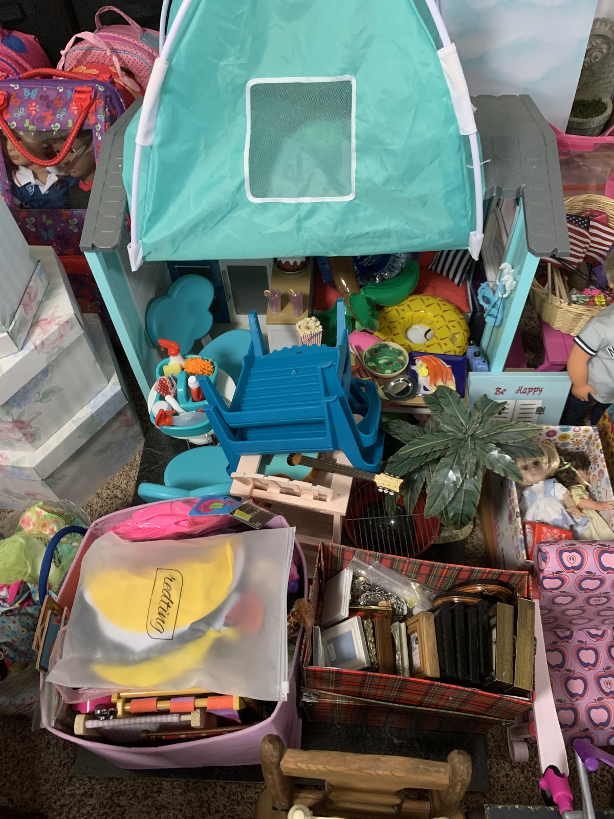 Behind them is the doll kitchen (see in the corner there) surrounded by all manner of doll furniture and accessories... All of hte dolls in that grouping right behind Josh and Heather Doll? They are all, every single one, dolls that have been thrifted lately (in the last few months) and who are sitting there waiting for their makeovers. I don't know if you can see her but I even have a nearly new JoJo Siwa doll in there.