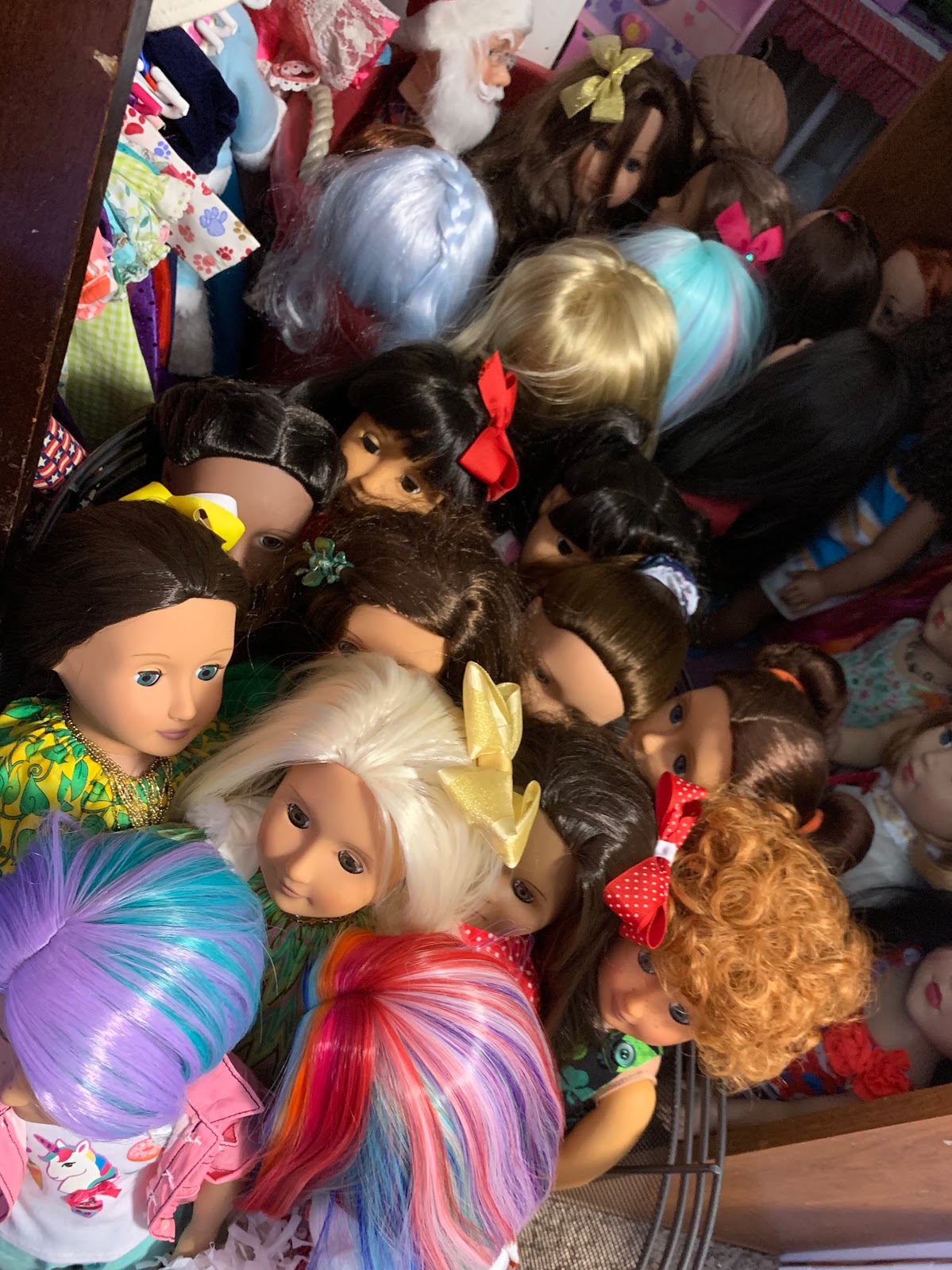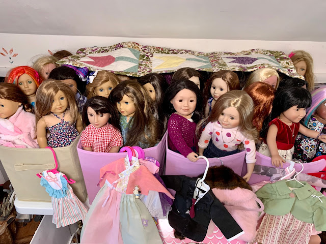 Here is one of my doll storage areas. I have them all on top of a table in bins... See the fabric 'runner' sitting on their heads, I keep those on top of dolls often to keep the dust off them. It means you can't alway see all of them but it's better than dusty doll hair!