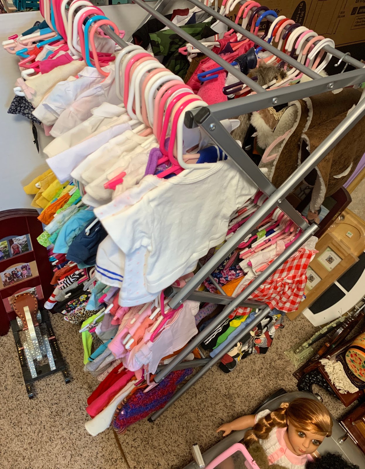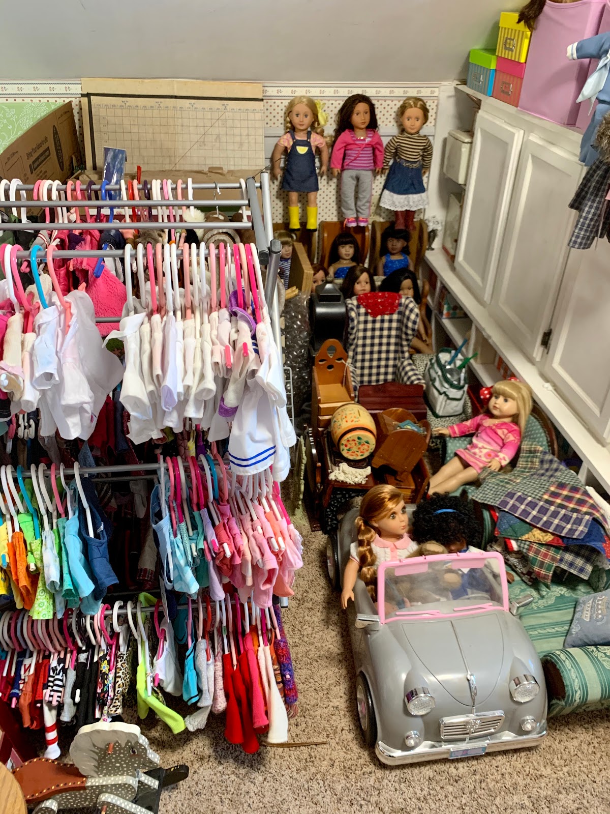 If you turn around this is what you see... I have a doll closet made out of one of those foldable dryers made for real clothes but that makes a nifty closet. I need to get more hangers and hang up more of the clothes in bins. Always something to be done when you're a busy doll mommy! Eh? I also store a lot of the furniture and obviously the awesome doll car I got from the lovely Frann as a gift.
