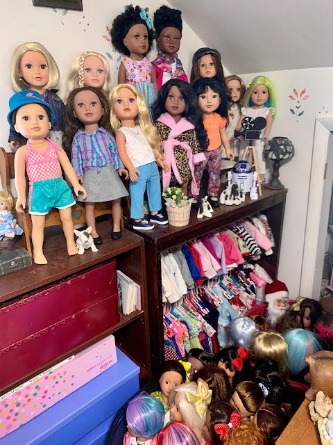 Another half closet also holds doll stuff... See the shelf with the old school Madame Alexander doll and Gotz girl in a wheelchair? That's just a standard three shelf bookcase with shelves removed and turned on it's side. It's where most of my Madame Alexander 18inch dolls live... I do TRY to keep them in groupings by doll manufacturer because I, when I set up scenes, try to pick a group with one doll from each type, as much as is practical anyway. That way I don't usually end up with duplicate doll face sculpts in one posting. Or that's the goal anyway. If I have one. Hahaha.