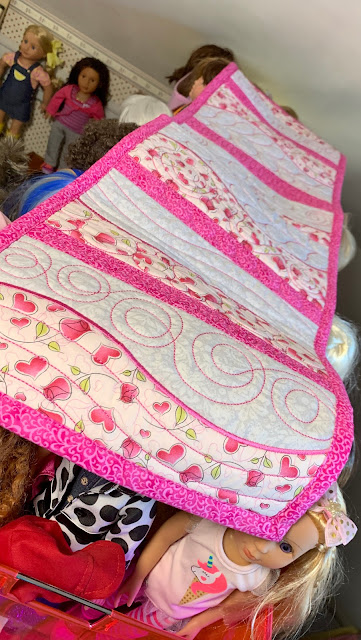 Here is the runner on top of the shorter dolls. As you can see, it doesn't cover all of them perfectly but I rotate them enough that it does a good enough job of keeping dust off my lovely dolls.