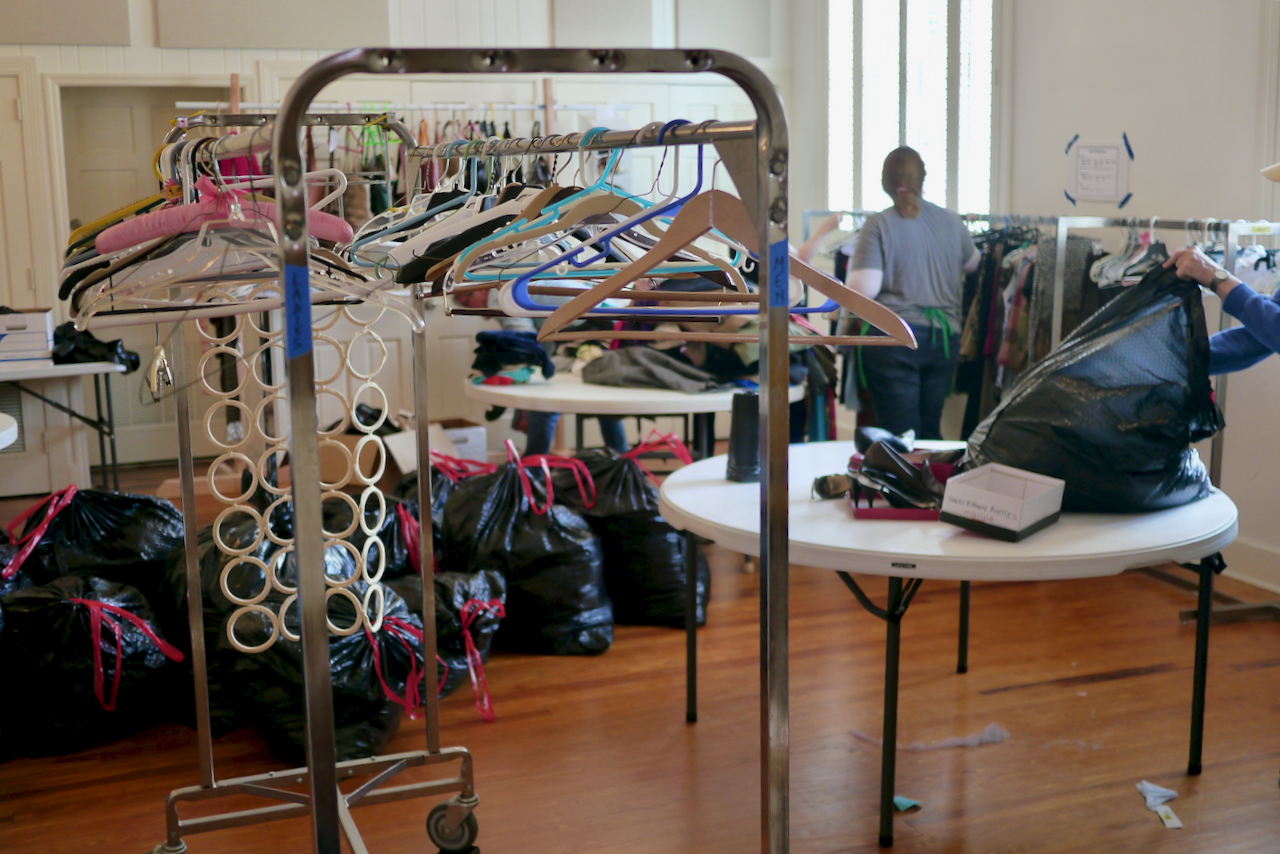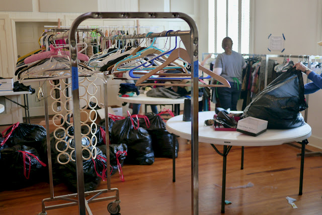 Above is the men's table that she had not an hour earlier made neat and tidy. A little later Brandy came to help and turns out she also did not mind folding. I, on the other hand, was not a fan. I'd remove empty hangers all day long, but folding....no thanks!
