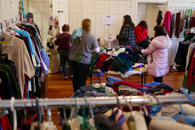 Although we knew our neat piles would end up in disarray after the doors opened, one woman really added to it by, get this, taking one of our boxes with extra clothes from under the table and literally dumping it into the middle of the "medium size" table. I did not see her do it but I sure saw her carrying around the box! The day absolutely flew by with a steady stream of folks, sometimes up to 25 at a time filling the chapel. Needless to say, we went home bushed. Our room looked like this at the end of the first day.