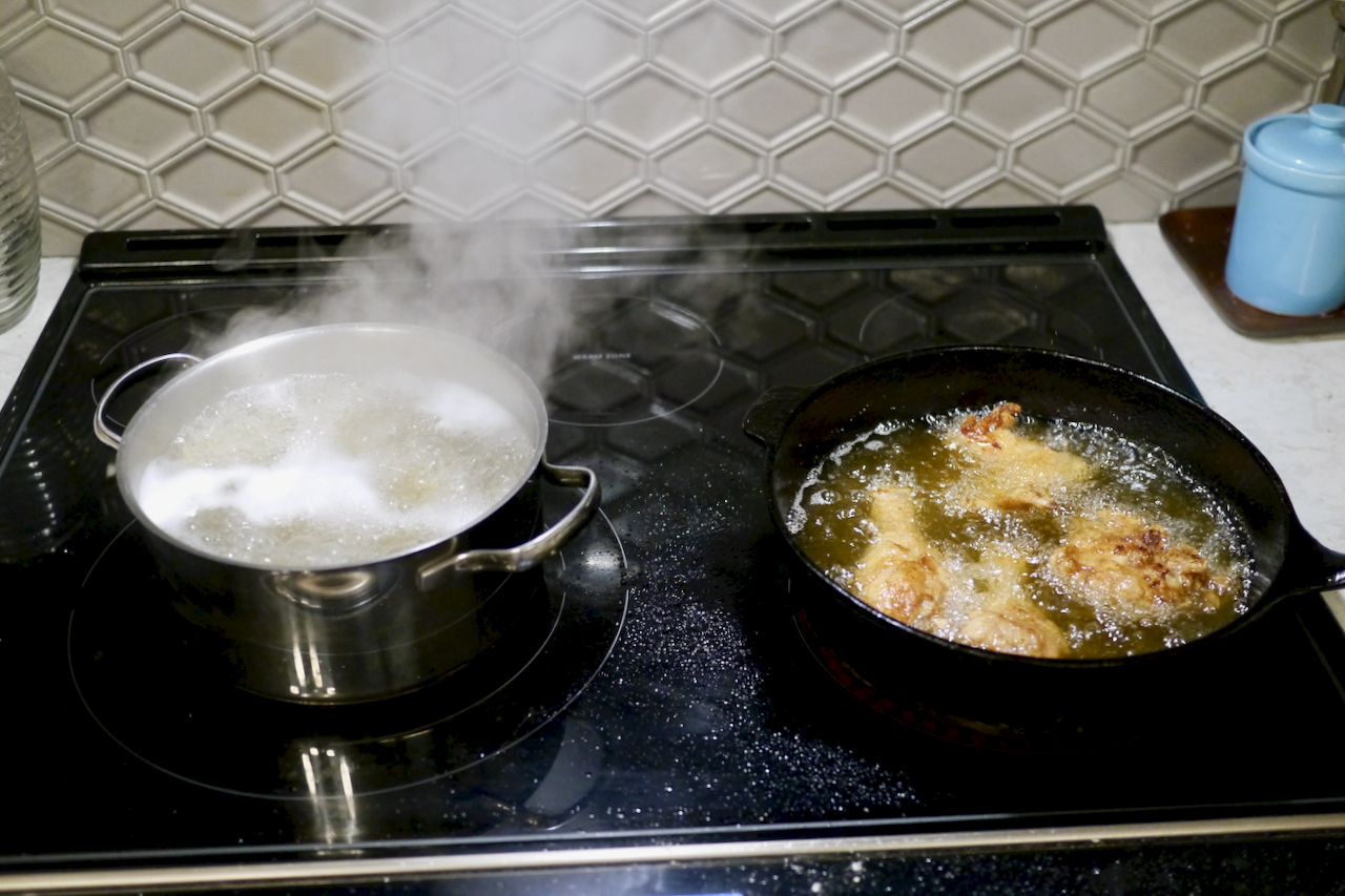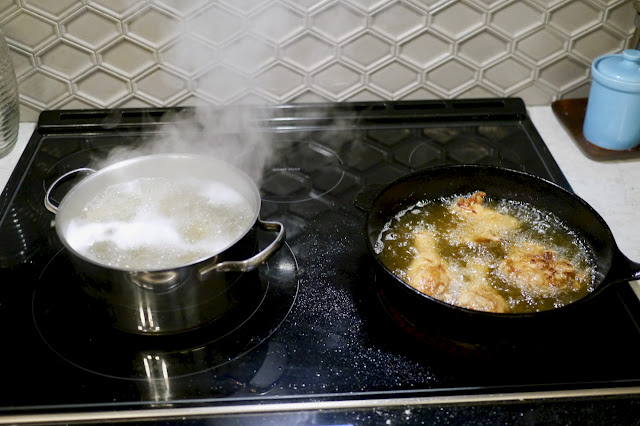 Then it was time to get to work in the kitchen, frying chicken and boiling bowties for a pasta salad. What a mess that makes on my stove but totally worth it!