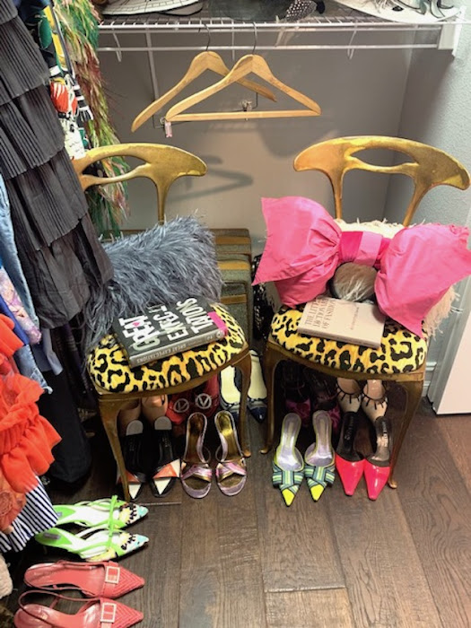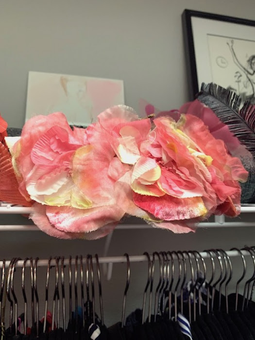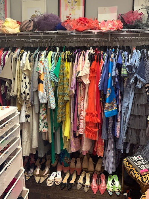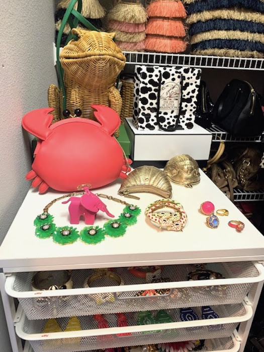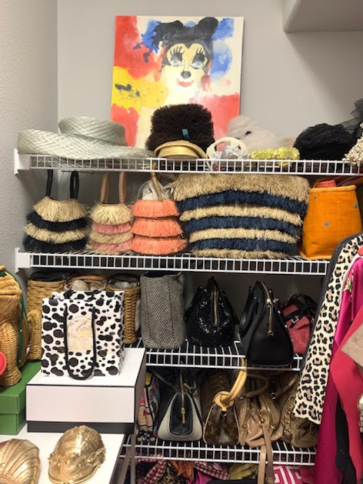 I also organized all of my accessories in the Container store drawer unit and my collection of vintage hats on the shelves. I created a gallery wall leaning the art on the shelf. It's all very girly and fun and very me.