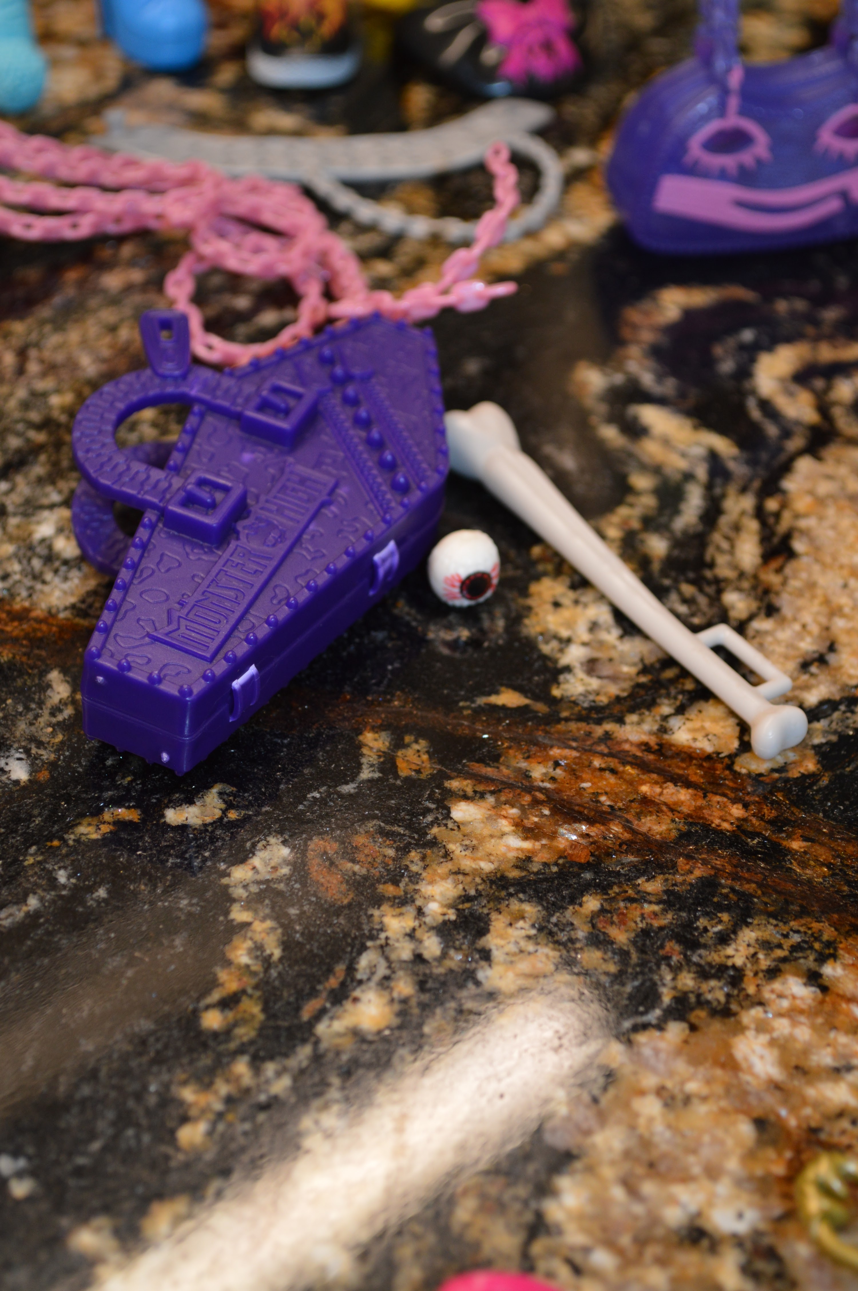 And a few more bits and pieces. Some Barbie accessories, some Monster High. A pair of mismatched purple shoes in the corner. Some hangers. A crown/headband for a Wonder Woman Doll.