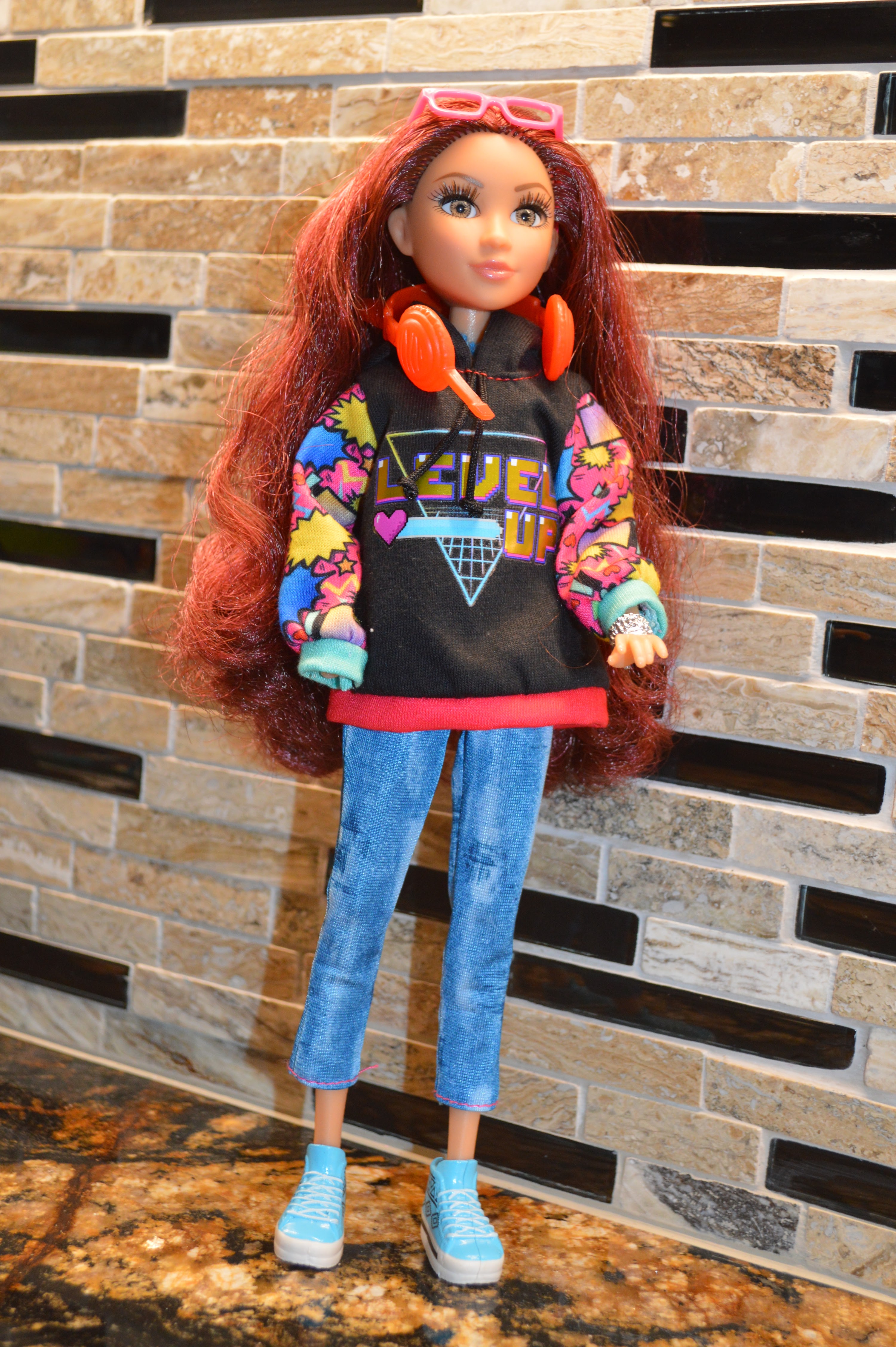 I originally had this Wild Hearts Crew outfit on a MyScene doll but thought it would look much better on Camryn. Yes, Camryn is a much better choice in my opinion! And even better, the sweatshirt is so oversized, all her clothes are underneath so I didn't have to remove and store any.