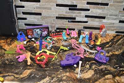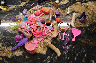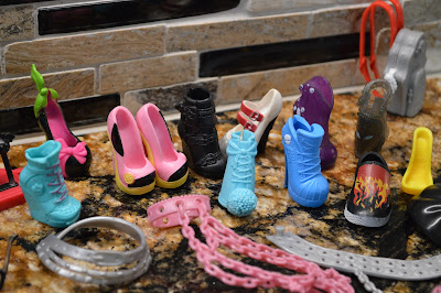 Shoes! The pink, black and yellow ones are from the Draculaura/Clawd Wolf two pack. One fire shoe for Heath Burns. The one in front with a pom pom is actually a leg warmer for the Fright Mares horse. Don't have another one though. There are the pink chains for Kiyomi Haunterly.