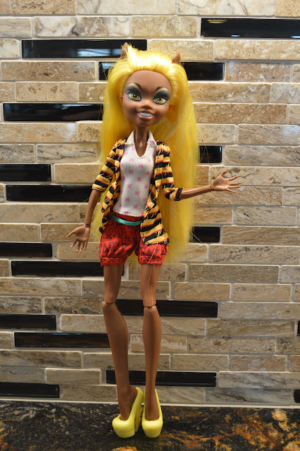 Wolf Family 4 Pack Clawdeen. Notice how the print on her shirt matches Clawd's? I gave her the shoes from Dance the Fright Away-Welcome to Monster High Clawdeen (since I put the boots back on Abbey.)