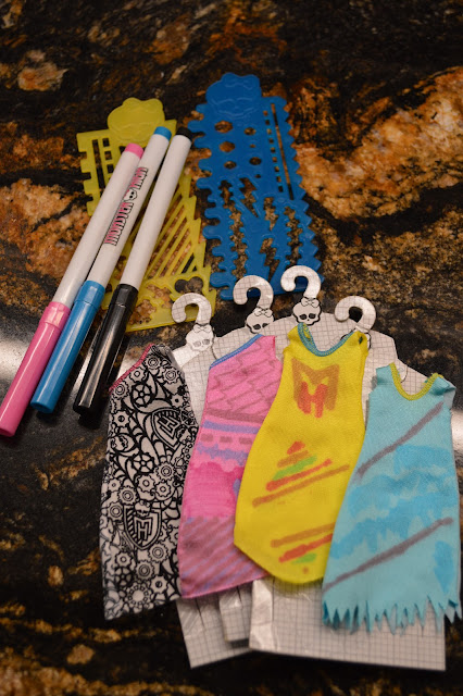 First we have the stuff that comes with Designer Booo-tique Frankie Stein. Four dresses, two stencils, 3 pens and cards to put the dresses on so they don't bleed through when you draw on them. I think the pens are supposed to wash out of the fabric but no dice. The designs have been on there much too long so a soak in Oxy Clean did absolutely nothing.