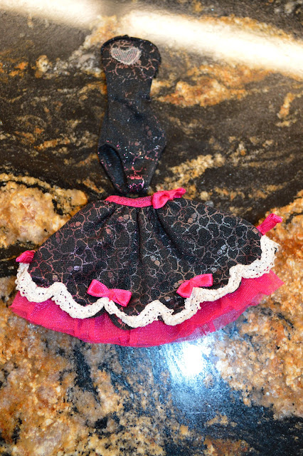 The dress for Sweet 1600 Draculaura. Some of the shiny has wore off of this dress. She must have had a lot of playtime!