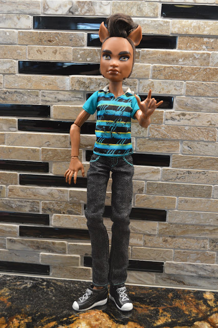 And Clawd! I do have a complete Clawd. This is from the Wolf Family 4 Pack. He is originally wearing shorts but I didn't have those. These are the pants from the other Clawd, the one that came in the two pack with Draculaura. His hair is in really good condition and he has flocking on the sides of his head and for his sideburns. Those were in good condition too so I was glad I had an okay looking one to put up on the shelf.